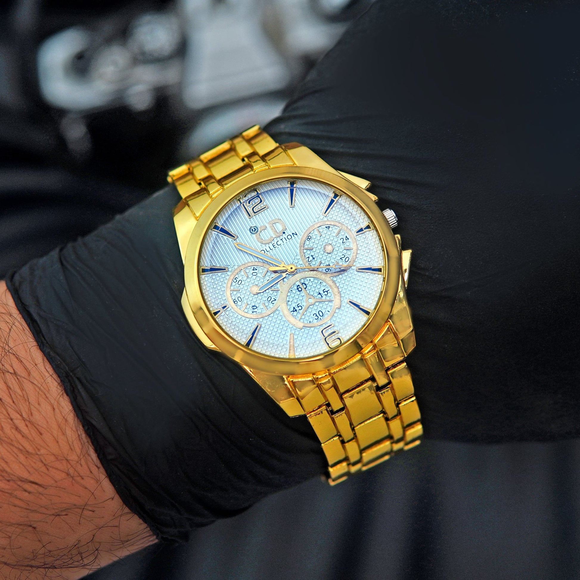 Stainless Gold Band Quartz Wrist Watch Black CD Collection Turntable Dial Men
